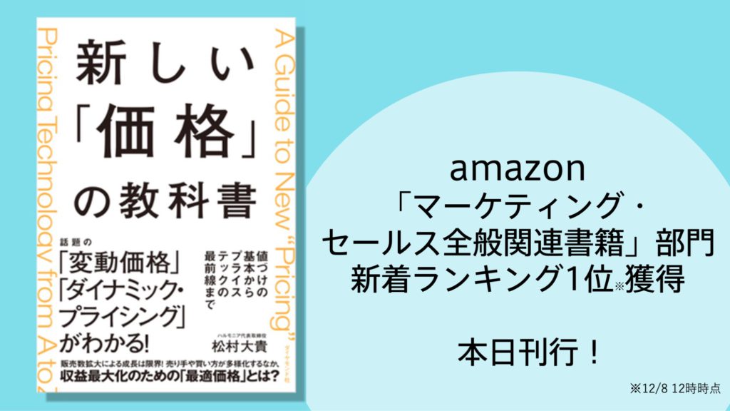 価格戦略の立案・実装支援とシステム開発・導入支援を一気通貫して行うハルモニア株式会社(東京都千代田区、以下ハルモニア)のCEO松村大貴の著書『新しい「価格」の教科書 値づけの基本からプライステックの最前線まで』が本日12月14日に刊行され、明日15日より順次書店などで販売開始されます。